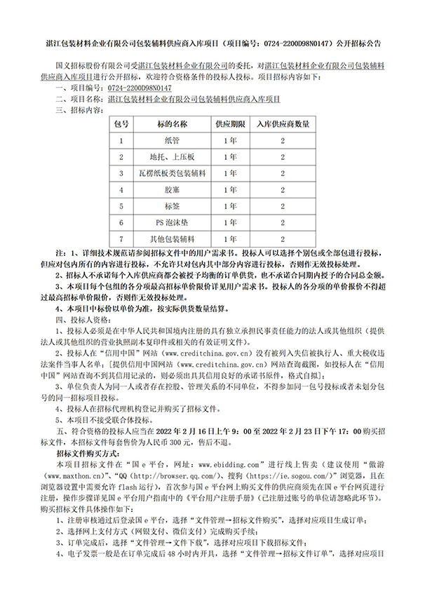 华人策略celue委托代理招标方国义招标股份有限公司对包装辅料进行公开招标,并于2022年2月16日在国e网(网址:www.ebidding.com)公开发布招标公告。