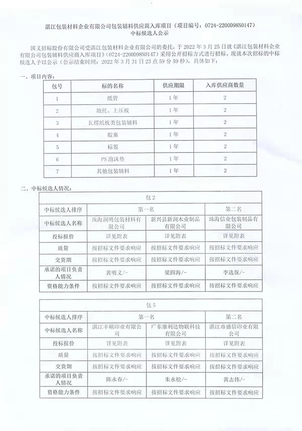 华人策略celue委托代理招标方国义招标股份有限公司,于2022年3月25日就包装辅料供应商入库项目(0724-2200D98N0147)采用公开招标方式进行招标,现就本次招标的中标候选人予以公示,公示结束时间为2022年3月31日23点59分59秒。