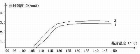 ....由于无规二元共聚物、无规三元共聚物和混合物三种热封材料的熔点依次为135°C、125°C、和115°C,呈逐步降低的趋势,因而它们的初始热封温度分别由高降至低,依次为115°C、105°C和100°C(以2.0N/mm2作为最低热封线),由热封曲线图可以看出,这三种材料的热封范围分别为: