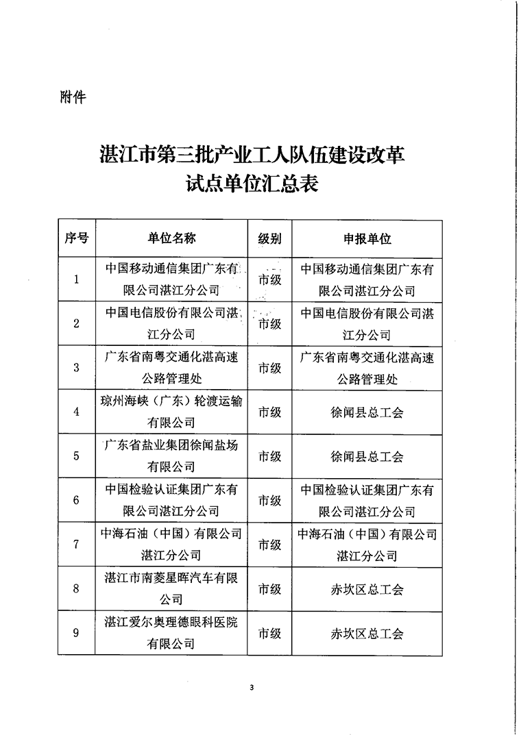 近日,经湛江市推进产业工人队伍建设改革领导小组办公室审批,市推进产业工人队伍建设改革领导小组办公室下发湛产改办〔2023〕7号《关于开展命名湛江市第三批产业工人队伍建设改革试点单位的通知》,我司被评为“第三批产业工人建设改革试点单位”。