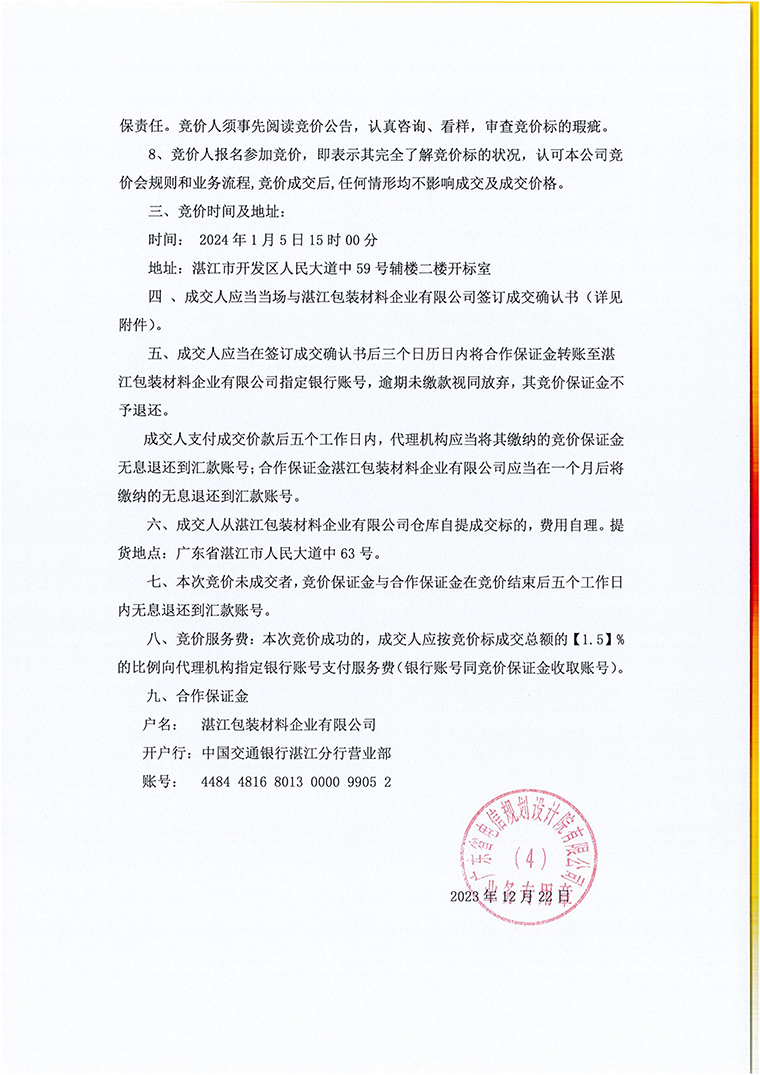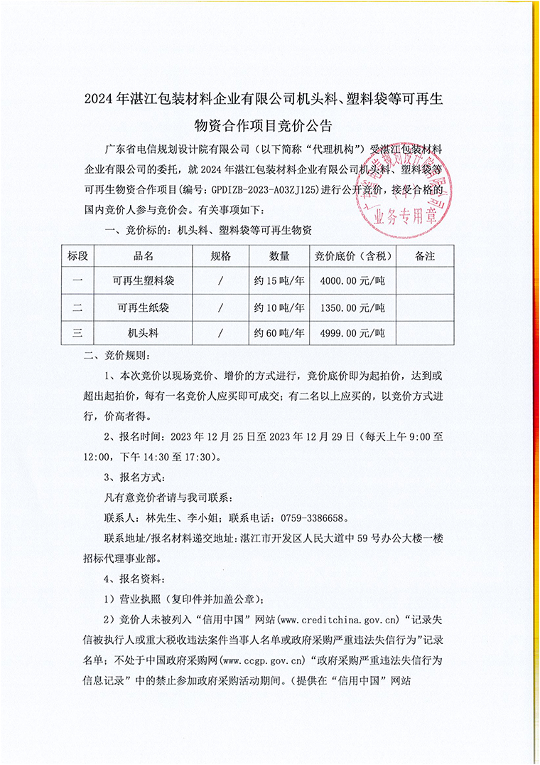 2024年华人策略celue机头料、塑料袋等可再生物资合作项目竞价公告