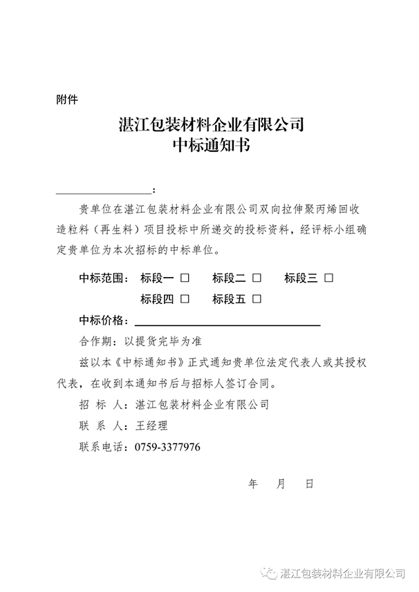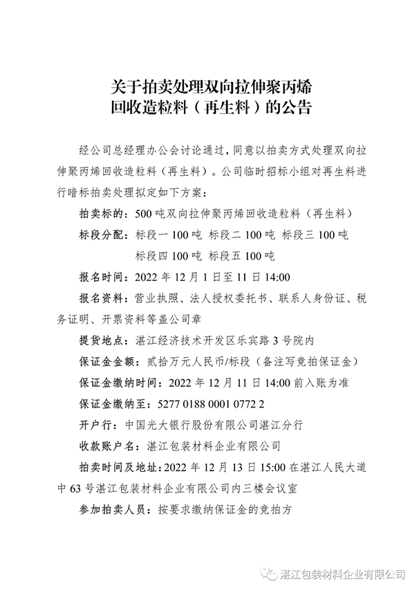 关于拍卖处理双向拉伸聚丙烯回收造粒料(再生料)的公告
