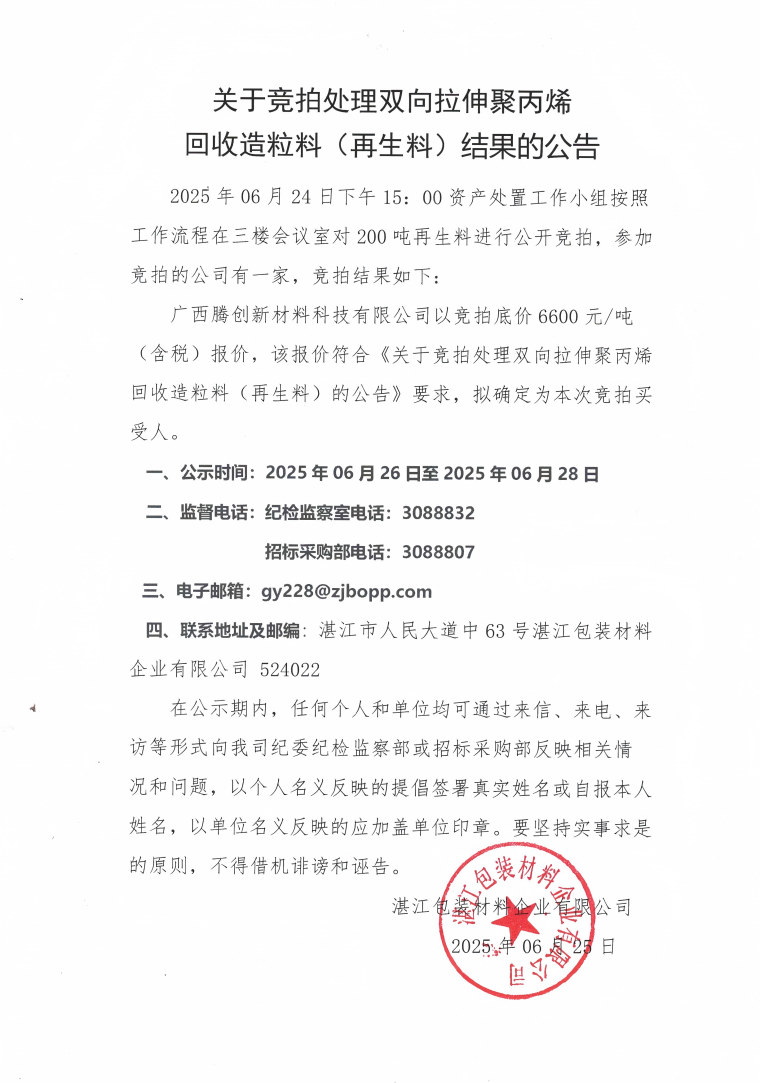关于竞拍处理双向拉伸聚丙烯回收造粒料(再生料)结果的公告