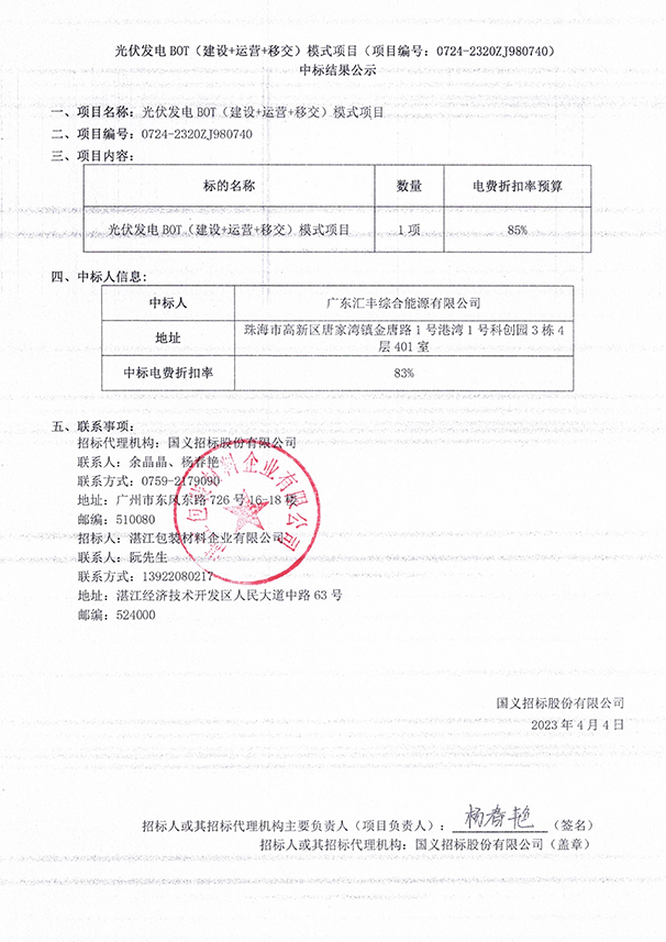 光伏发电BOT(建设+运营+移交)模式项目(项目编号:0724-2320ZJ980740)中标结果公示
