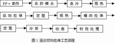 ....总体上,逐次拉伸法是将挤出的PP片材先经过纵向拉伸、后横向拉伸来完成二次取向过程。生产过程中主要控制的工艺参数有生产线速度、温度、拉伸比等。